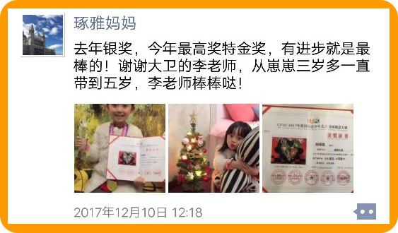 去年銀獎,今年最高獎特金獎,有進步就是最棒的!謝謝大衛的李老師,從崽崽三歲多一直帶到五歲,李老師棒棒噠!